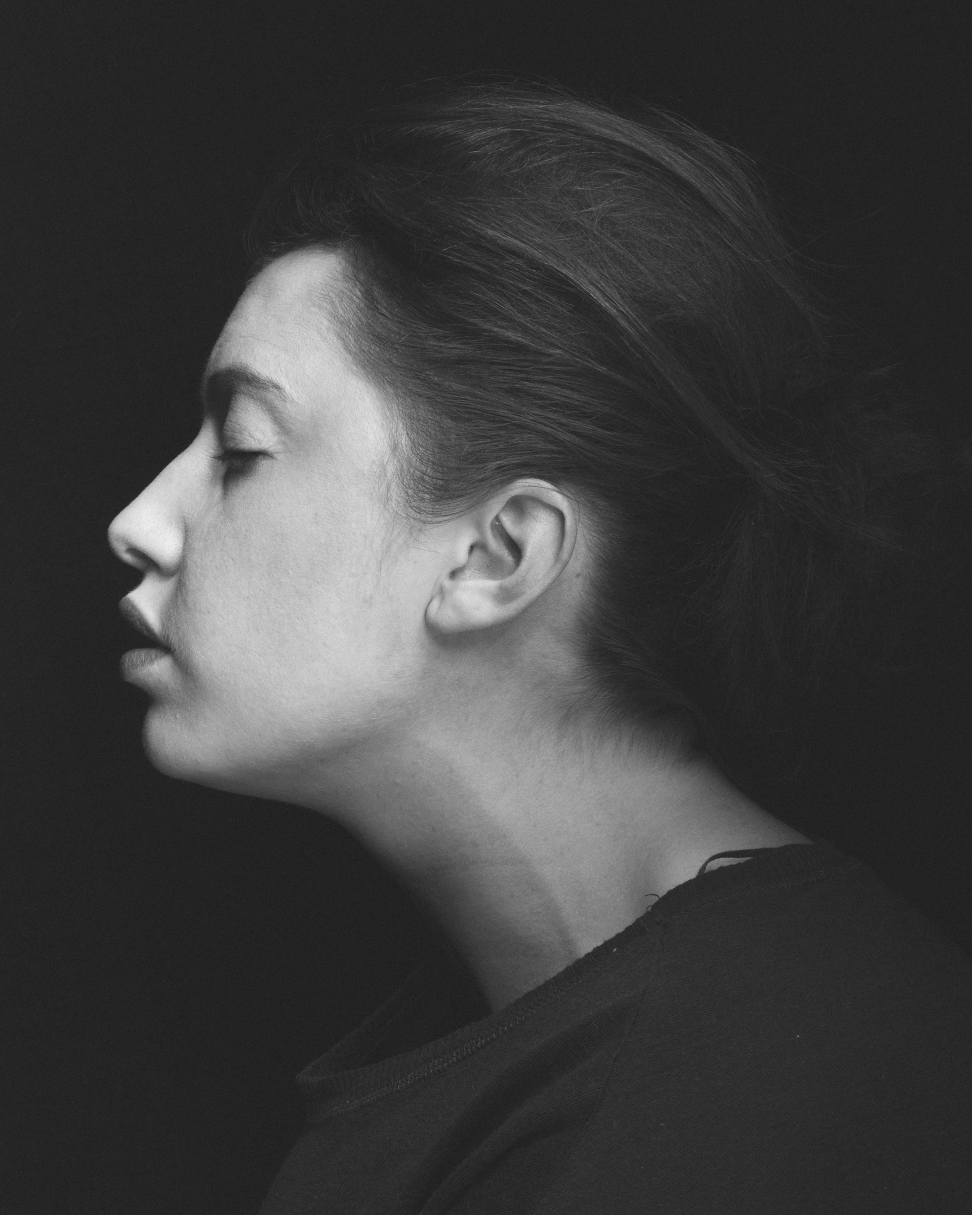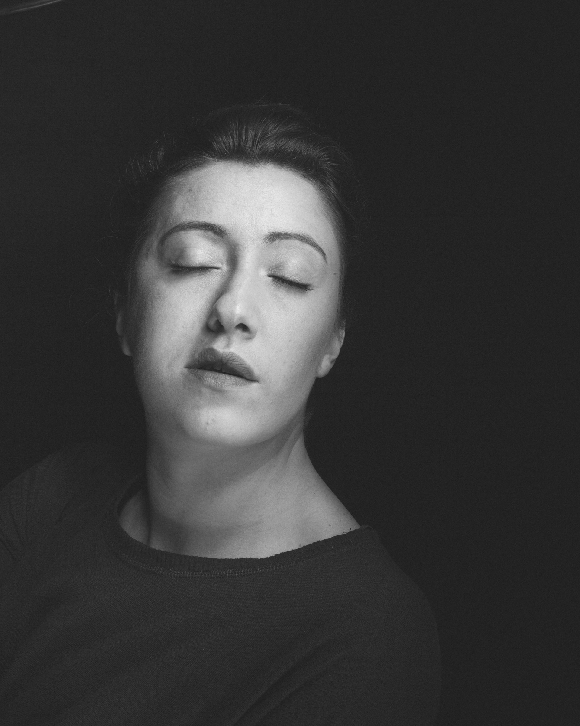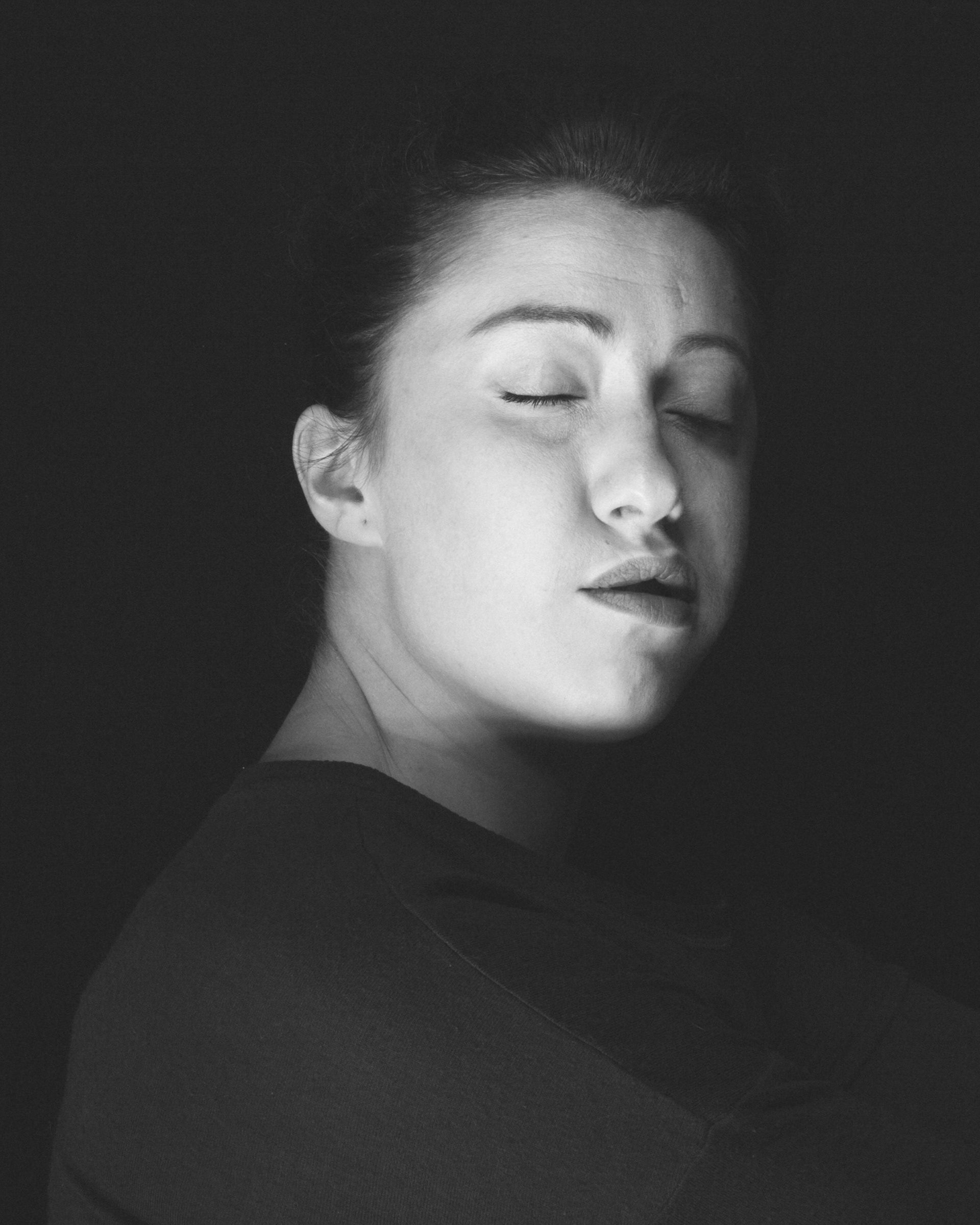 Impesenteur rassemble les variations d’un même visage, comme autant de micro-dérives d’un corps détaché du monde. Les yeux clos, la modèle flotte dans un fond noir qui la soustrait à toute attache, comme si la gravité du réel avait été coupée. Chaque infime déplacement de la tête ouvre une facette nouvelle : assurance, abandon, résistance, douceur inquiète. Le visage ne change presque pas, et pourtant tout bouge : l’ombre, la bouche, la ligne du cou, la tension des muscles. La série explore cet espace suspendu entre veille et sommeil, entre pose et retrait, où l’on ne joue plus un rôle mais où l’on se laisse traverser. En répétant le même cadre, elle fait apparaître la pluralité intérieure d’une seule personne, la constellation d’émotions qui habite un visage. Impesenteur est moins un portrait qu’une orbite : un mouvement circulaire autour d’une présence, observée dans son flottement le plus intime.