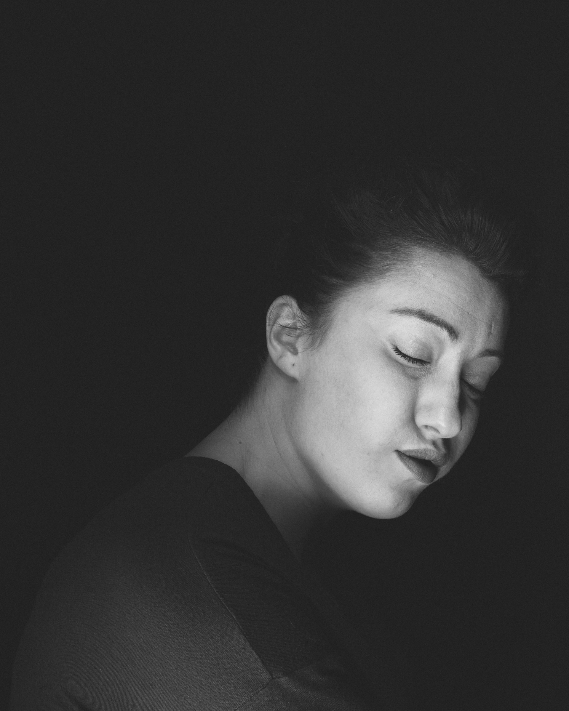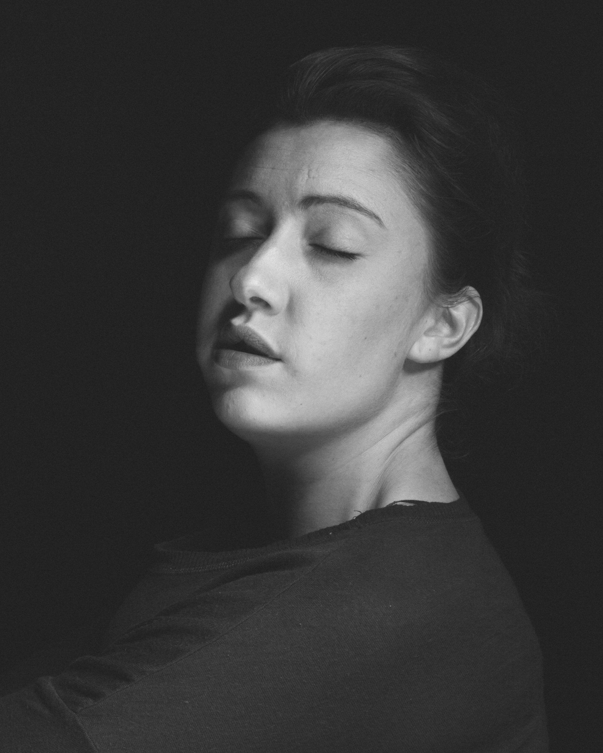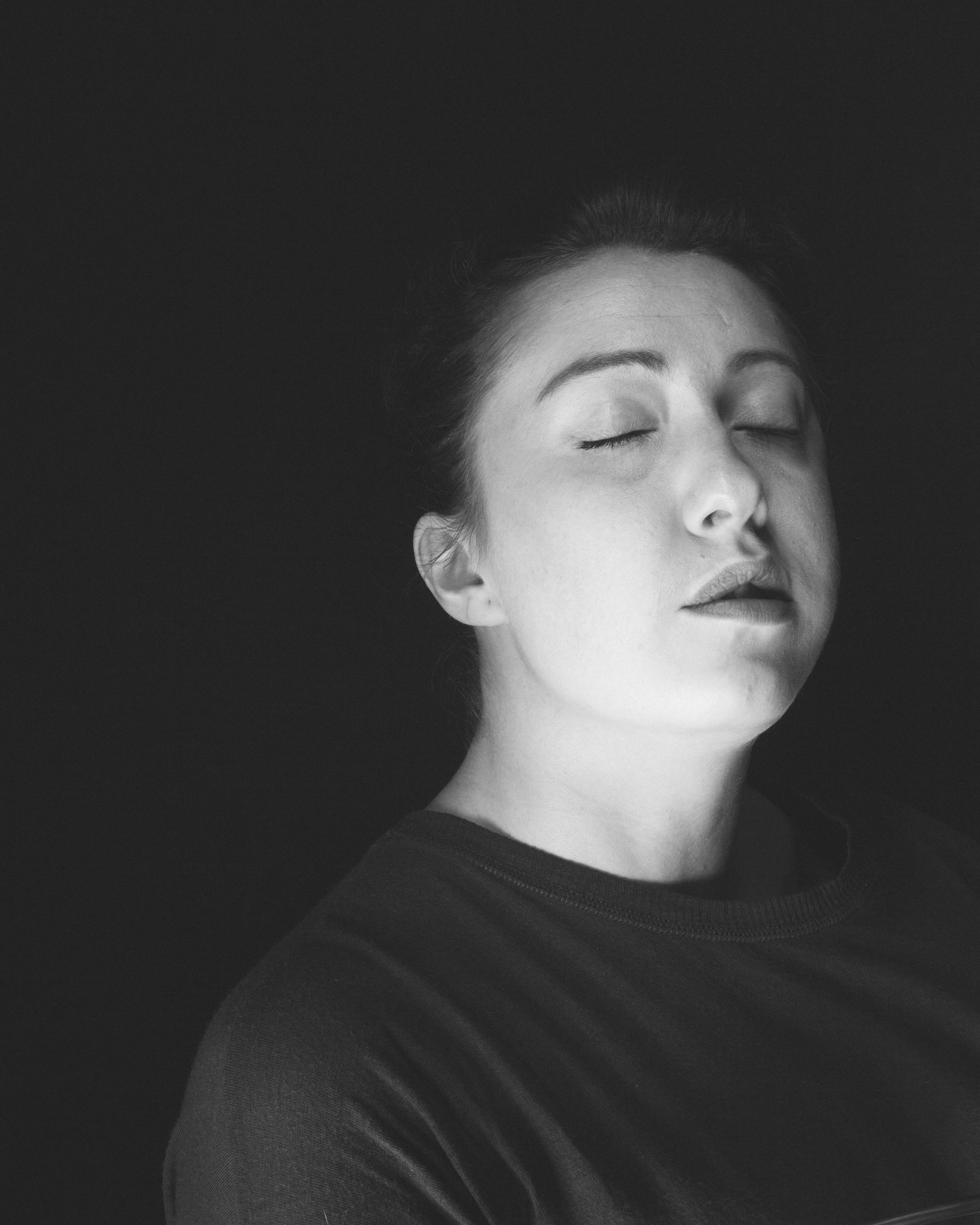 Impesenteur rassemble les variations d’un même visage, comme autant de micro-dérives d’un corps détaché du monde. Les yeux clos, la modèle flotte dans un fond noir qui la soustrait à toute attache, comme si la gravité du réel avait été coupée. Chaque infime déplacement de la tête ouvre une facette nouvelle : assurance, abandon, résistance, douceur inquiète. Le visage ne change presque pas, et pourtant tout bouge : l’ombre, la bouche, la ligne du cou, la tension des muscles. La série explore cet espace suspendu entre veille et sommeil, entre pose et retrait, où l’on ne joue plus un rôle mais où l’on se laisse traverser. En répétant le même cadre, elle fait apparaître la pluralité intérieure d’une seule personne, la constellation d’émotions qui habite un visage. Impesenteur est moins un portrait qu’une orbite : un mouvement circulaire autour d’une présence, observée dans son flottement le plus intime.